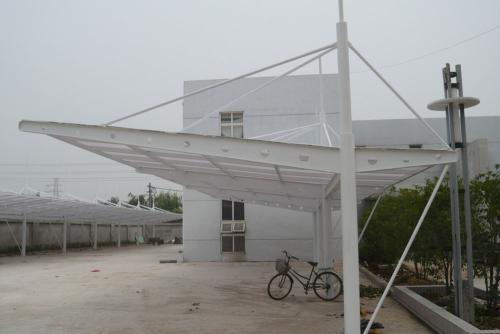膜结构遮阳棚按其结构形式可分为钢结构、张拉结构及充气结构;按膜材特性又可分为永久性膜结构(膜材使用年限可超过25年)、半永久性膜结构(膜材使用年限为10-15年)及临时性膜结构(膜材使用年限为3-5年);按膜材成分又可分为PVDF膜材、PTFE膜材及ETFE膜材。用于膜结构中的膜材是一种具有高强度、柔韧性好的薄膜材料;中心的织物基材分为聚酯纤维及玻璃纤维,而作为涂层材使用的树脂有聚氯乙烯树脂(PVC),硅酮及聚四氟乙烯树脂(PTFE),它具有轻质、柔韧、厚度小、重量轻、透光性好;对自然光有反射、吸收和透射能力;它不燃、难燃或阻燃;具有耐久、防火、气密良好等特性;表面经氟素处理(涂覆PVF或PVDF)的膜材、自身不发粘、有很好的自洁性能。